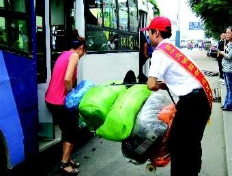 5日,工行临沂兰山支行的青年志愿者帮助市民扛重物o连日来,青年志愿者纷纷走上街头开展志愿活动o 通讯员杨莹桂强记者魏玉娜摄