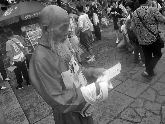 “大家快看,山下的那位穿红衣服的老人今年又来参赛了。”站在终点的一位裁判说,其他在场的人纷纷把目光投到了这位老人的身上,只见他身穿全套红色服装,腰间挂着一个黄白相间的包,迈着矫捷的步伐朝着终点冲刺,还不时用毛巾擦着脸上的汗。刚到终点,裁判员就赶紧上前搀了他一把,并把成绩证书交给了他,还不停地连声夸赞他速度快,现场也传来了一片称赞的声音。