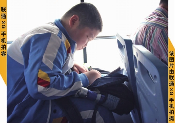 6日早上6点半,在开往八十八医院的2路公交车上,一位小学生在学习。