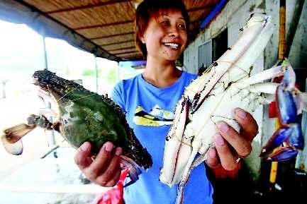 6日,在沙子口码头,一位摊主正叫卖新鲜的螃蟹。据了解,目前各种海鲜价格平稳,螃蟹每斤最低在30元左右。 本报记者 杨宁 摄影报道