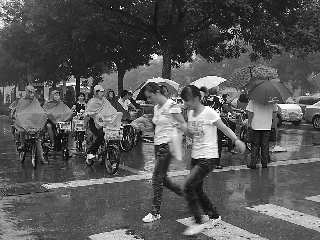 6日下午1点,市区下起—阵急雨,骑车在东昌路上的市民,想到百货大楼路口的遮阳棚下避雨,却发现遮阳棚不见了。