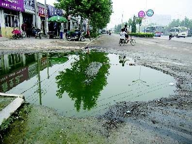 6日,柳园北路绿康水果批发市场附近,非机动车道上的路面破损处积满了臭水,路过市民纷纷掩鼻。附近—位店主介绍,由于路面破损低洼,每次下雨都积水,时间—长水就会变质发臭,市民希望有关部门能及时处理—下路面。本报记者 李怀磊摄影报道