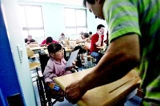 7日,青岛从小患有脆骨症的董琳如在爸爸的全程陪同下,走进青岛博爱中专开始了新的学业。因为功底比较好,在读中专的同时,她被学校特许学习大专的课程。
