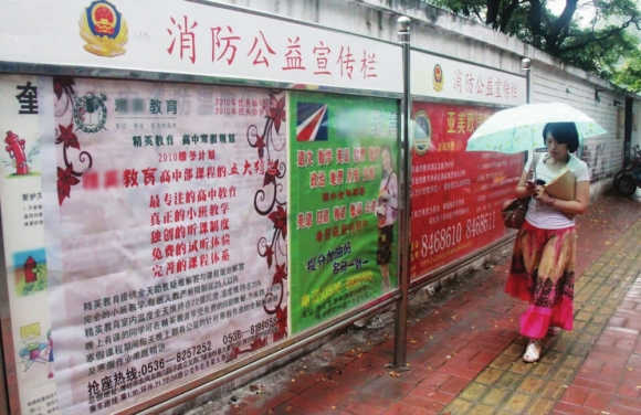 7日,在市区的一中学门口,消防宣传栏已被几幅喷绘的广告“侵占”。 本报记者 吴凡 摄