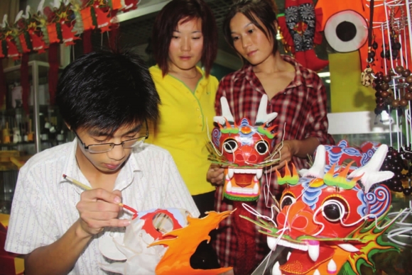 7日,在火车站地下广场内,一家风筝专卖店的老板正在绘制龙头,