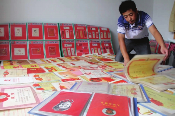 高平礼生于1970年,对文革只有一点点模糊的记忆。“可是,搞收藏如果不懂历史,就没法跟人交流,也很容易被忽悠。”高平礼拿起两张印有毛主席头像的结婚证说,其中一张就是因为自己知识不够,而收到了赝品。