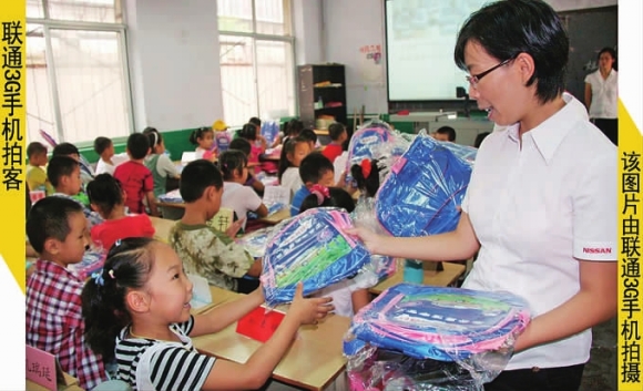 6日,泰安嘉信东风日产市场部经理盛丽丽,为泰安市第一实验学校一年级的新生发放书包。当日,由本报和泰安东风日产嘉信汽贸有限责任公司联合举办的“开学大礼包发放活动”结束,活动共为泰城3所学校的一年级新生发放书包1500个。