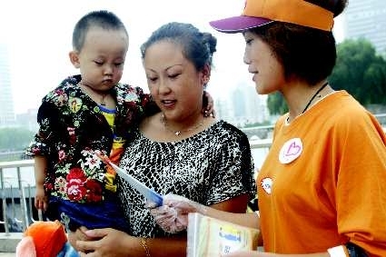 7日,在市人民广场,志愿者正在向市民发放公共文明手册o当日,共青团临沂市委、