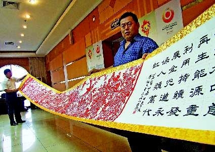六米的长卷上,100只鸟儿栩栩如生、活灵活现。“剪了将近半年。”来自陵县的民间手工艺人石成才说,得知德州举办第四届太阳城大会,我心里非常高兴,想通过剪纸作品为大会祝福。为了表现100只鸟儿各不相同的形态,石成才剪坏了十多张剪纸。