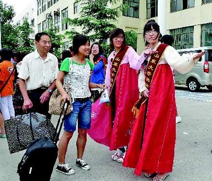 7日,山大威海分校新生报到现场,两位身穿韩国民族服装的迎新志愿者吸引了众人的目光。据了解,为了让该校韩国学院的大一新生一入校便感受到专业特色,韩国学院的迎新志愿者特意穿上了韩国民族服装。本报记者刘洁摄