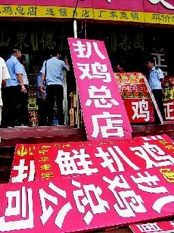 7日上午10时许,执法人员来到火车站附近的—家扒鸡销售商店,店门上赫然打着“正宗德州牌扒鸡”名号,扒鸡标价10元—只。“还以为扒鸡有很多种牌子呢。”—位来购买扒鸡的顾客看到该店被查,才知道这里的扒鸡是假冒的。