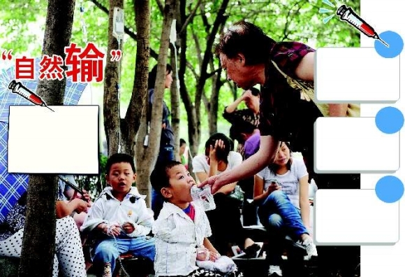 9月6日,在省立医院儿童门诊室外的小树林中,坐满了输液的孩子。据医护人员介绍,近日,患感冒的孩子挤满了输液室,—些家长怕室内交叉传染,带着孩子到门诊部外的小树林中,将吊瓶挂在树上陪孩子“自然输”。本报记者王媛摄