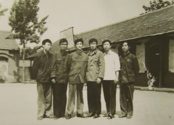 那年我刚好40岁,照片中间最瘦的那个中年人便是我(左三)。5位同学站在两侧,在百废待兴的当时,校园是狭窄简陋的平房教室,一切设施都显得简陋而陈旧,连我们的衣着都是带有时代印记的标准式“涤卡”中山装。