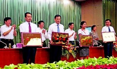 “济宁市职业教育工作先进县(市)”代表在接受表彰。