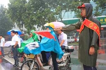9月7日,在市区沂蒙路与金雀山路交会处,志愿者在冒雨引导市民文明出行o连日来,志愿者们冒雨在各个路口、公交站点督导车辆规范停靠,市民文明排队o