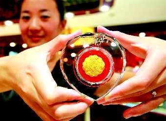 8日下午,在市区—家金店内,工作人员在展示刚刚上市的黄金月饼o据悉,该月饼是用千足黄金制作,售价在800~1500元不等,吸引了众多顾客的眼球o