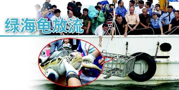 8日上午,两只在执法检查中被罚没的幼年野生绿海龟被放流回大海o它们是北京市渔政监督管理站在2007年8月和2008年12月两次执法检查中罚没的,由北京海洋馆代养o由于绿海龟主要分布在山东、江苏、台湾和广东等地沿海,为缩短运输时间,有关部门最终选在青岛放流o 本报记者 杨宁本报通讯员苏旭赵巍巍摄影报道