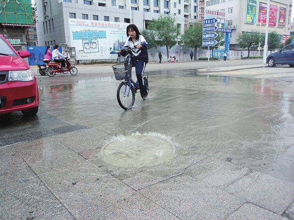 在财源大街与通天街的交叉路口,一处下水道因为被一些石头和餐馆剩饭菜堵塞而出现“井喷”,污水不断从井盖处像喷泉一样喷出来,在财源大街东段流了近200米长的距离。