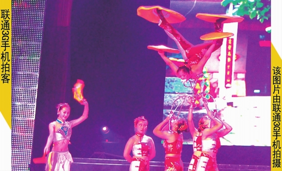 8日晚上,由志高·山景叠院冠名的登山节大型室内文艺演出———天歌,在泰山影剧院上演。晚会上,《圣人圣山》、《泰山女儿茶》、《拴娃娃》等九个精彩纷呈的歌舞、杂技表演,充分表现了泰山的碑刻、茶、石敢当和煎饼等特色传统文化,令所有到场的市民大饱眼福。图为泰安市歌舞团演员用舞蹈演绎泰山煎饼文化。