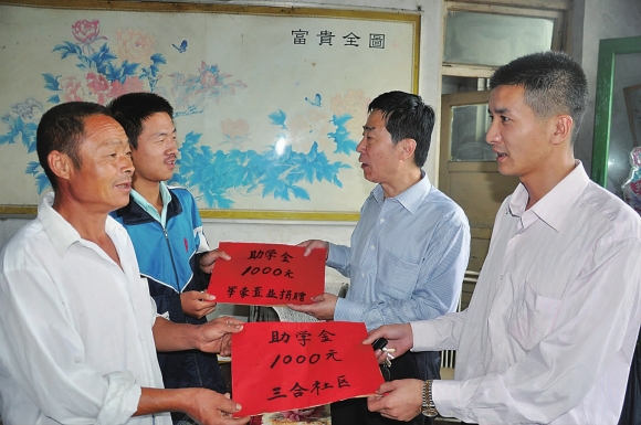 7日上午,泰安军豪置业有限公司相关领导及三合社区居委会工作人员,为社区应届大学新生刘华柏送去了2000元的助学金。据介绍,正值开学之际,泰安军豪置业投入专项慈善基金,与三合社区居委会联合开展了一次爱心助学活动。7日,三合社区共有4名应届大学新生拿到爱心助学金。通讯员 刘东 摄
