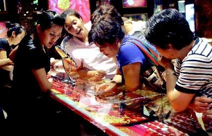 7日,解放路~家金店里,市民在选购黄金饰品o据了解,十~黄金周临近,不少新人选择在此期间结婚,作为婚嫁物品的黄金饰品也进入销售旺季o记者展萍摄