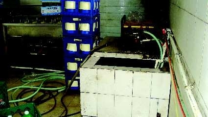 执法人员在检查中发现,该窝点陈设凌乱,啤酒贮存罐、灌装设备、灌装好的啤酒、空啤酒桶和各种工具、杂物、废弃物都堆放在一个大车间里,存在着交叉污染的风险;设备简陋,几根已经老化、硬化发黄的胶皮管和塑料管,几个锈迹斑斑、嗡嗡作响的压力泵就是全部的生产设备;操作粗放,胶皮管的接口、龙头处都沾满了油污,生产人员不戴手套、不洗手就进行灌装作业;设施不齐全、流程不规范,没有卫生消毒设备,没有入厂检验、出厂检验程序,每个桶中灌入多少啤酒,充入多少二氧化碳基本是跟着感觉走。