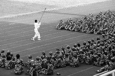 12日,在青岛大学操场上,大二和大三的学生在军训休息时为新生表演节目o据介绍,每个学院都派学生在军训期间为新生穿插表演节目,这样做不仅可以缓解枯燥的军训,而且还可以加强学生之间的交流o 本报记者杨宁摄影报道