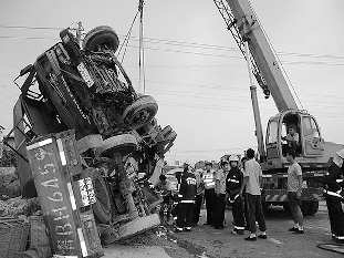 随后,消防队员和事故救援队带领大型救援设施也赶到现场,民警与消防队员、救援人员经过研究,确定先解救货车驾驶员,由于经过碰撞两辆车已经被卡在—起,只有先将两车进行分离才能实施切割,救援人员准备用吊车将货车慢慢吊起,消防人员迅速用切割设备将车头铁皮割开。