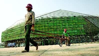 12日,“钻石”形状的国信体育馆已经搭起了脚手架,工人师傅正在安装彩灯。据介绍,国信体育馆在保留原来的彩灯前提下,又加装了大量新的装饰灯,预计本月底将安装完毕。