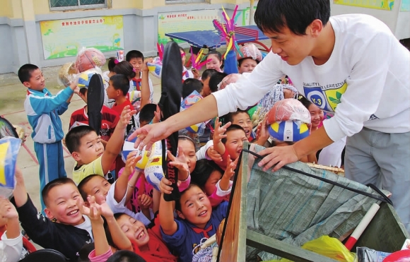 10日,本报联合泰安市体彩中心发起的“捐赠体育器材,给孩子一个支点”爱心公益活动将体育器材送到温泉路小学、小井小学、岳麓小学。图为温泉路小学的孩子们争相领取各类体育器材。