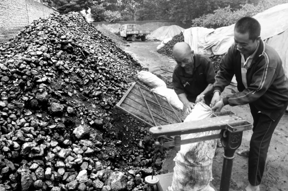 12日,在鸢飞路上的一家煤炭销售点内,两位工人正在装煤、称重。据了解,潍坊当地很大一部分煤是从包头运进,受京藏高速堵车影响,潍坊煤价连日来出现上扬。目前逐渐进入冬季储煤时间,煤厂平时3天能运抵的煤炭现在得需10天左右,成本增加不少。煤厂老板冯先生告诉记者,目前“低端”煤每吨的价格较往年上涨了约80元,“高端”无烟煤每吨上涨了50元左右。