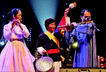 11日晚间,韩国演员演奏韩国民歌《阿里郎》。当晚,“经典共鸣”中韩大型演唱会在商业银行体育馆举行,演员和3000多名现场观众用歌声演绎激情共鸣。9月是中韩文化交流月,该演唱会是交流活动之一。