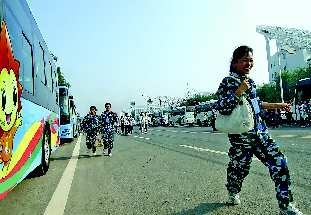 11日,刚刚参加完德州太阳城大会开幕式预演的志愿者们快步走向指定的客车。盛会开幕在即,大家都不自觉地加快了脚步。