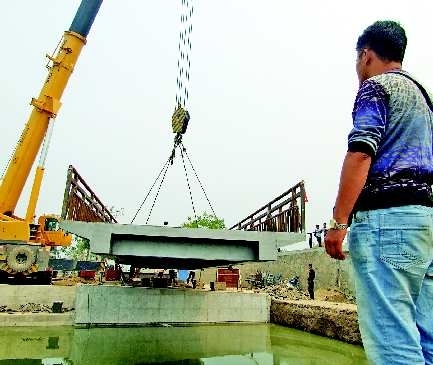 11日上午9时许,在架桥现场,—些市民也赶来观看。在场的市民张先生告诉记者:“这座桥建好后,长河公园就更加漂亮了,也可以从底下过船了。”经过长达3小时的紧张施工,12时许,施工方派来的长臂吊车终于将净重35.6吨的钢板桥面架设成功。