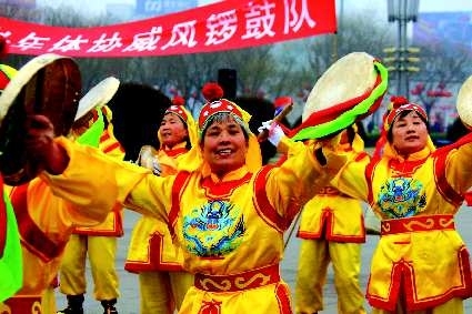 文/本报记者田慧 老年体协锣鼓队的队员们在广场演出 本报记者 马峰 摄