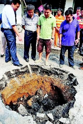 13日,历山路与山大南路交会处,被大车轧出—个直径近1米、深约2米的坑,多功能工程车开来对这个坑进行挖掘,市政人员研究路面塌陷的原因o 本报记者 王媛摄