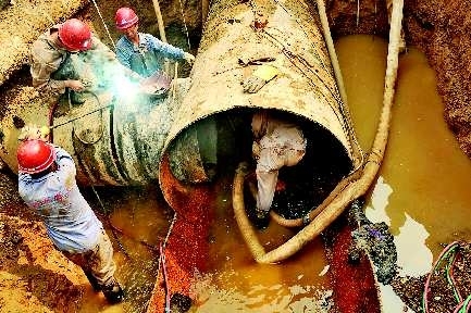 沿清河北路继续前行,记者注意到,师范路路口的合口工程相对比较密集,工程量也比较大。现场的抽水机、电焊、吊车都已经开始作业,施工人员边对旧管道进行排水,边对接新管道。施工负责人表示,此处的合口之所以复杂,主要是因为这里不仅要进行管道对接,还要对原管道进行“大手术”,对直径1.5米的管道进行切割。因此,此处合口施工是整个清河北路合口施工中最关键的一项。