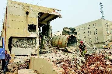 9月13日,由于道路扩建,有90余年历史的老裕兴化工厂南侧的这些厂房急需拆除,有工人在拆除的厂房废墟里寻找废旧钢筋。裕兴化工厂总厂已经在今年初完全停产,搬迁到天桥区化工产业园内。 本报记者董从哲摄