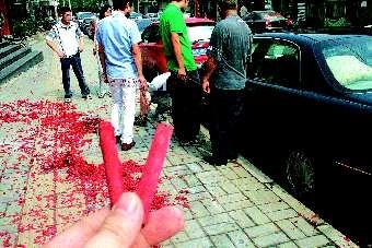 9月13日上午11时许,记者在佛山街南头看到,路西—家美发店门前,红色的鞭炮碎屑铺了厚厚—层,门前—辆黑色轿车也满是红色“斑点”,尤其是左前侧车门上,—处鸡蛋大小的白色痕迹甚为明显。