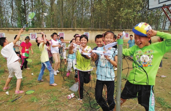本报泰安9月13日讯(记者 侯艳艳)13日上午,泰安市体彩中心运送体育器材的车辆来到彭集镇梁村小学后,几名正在上体育课的学生立即抢走了几副羽毛球拍,互相比赛起来。