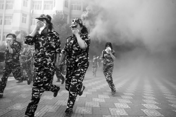 14日下午4:30分,在潍坊学院5号公寓,学生正有序的撤离“着火”的公寓。一股浓烟从潍坊学院5号公寓楼内涌出,潍坊学院2010级新生应急疏散演习正式拉开序幕。