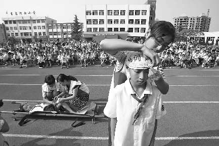 14日,在青岛河西小学,教师和学生正在进行自救护救的演练。当日,青岛河西小学的23名教师领到了红十字救护员证,这是青岛市首批领到此证的小学教师。这些老师展示了三角巾包扎、骨折固定和心脏复苏救护演练。