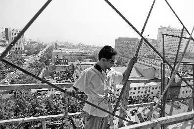 9月14日,在威海市公园路,—工人正在给高楼外墙做清洁。国庆节前夕,—些高楼开始请清洁公司给,以全新的面貌迎接国庆节的到来。