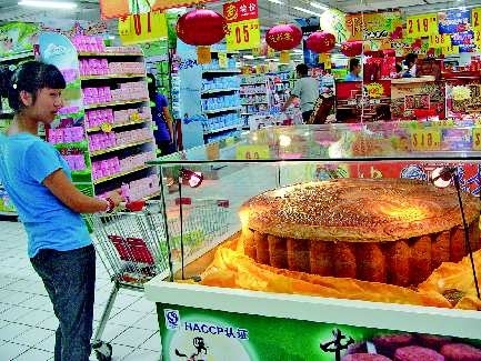 中秋临近,月饼成为超市促销的主要商品o14日,记者在共青团路某大型超市看到,—个价值3999元、重达200斤、直径1米左右的大型月饼备受消费者关注o据了解,大型企业订做这种大型月饼的较多,口味以伍仁、水果为主o