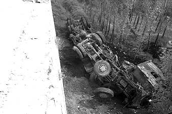 本报莱芜9月15日讯(闫秀玲 于晓敏 石刚)9月15日上午,在滨新高速公路,一辆半挂车接连撞了2辆轿车,一头撞开高速公路中央护栏,栽进另一侧距路面10米深的坡底(右图)。半挂车摔了个支离破碎,车上两人仅有驾驶员受伤,其他2辆被撞轿车上的人均无大碍。