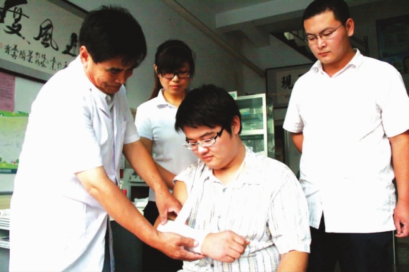 15日,在赵疃社区内,居民们正在学习怎样给受伤人员包扎。为了让居民在日常的生活中掌握自救、互救的能力,社区专门开展了相关的知识培训,并邀请医务人员进行现场指导。
