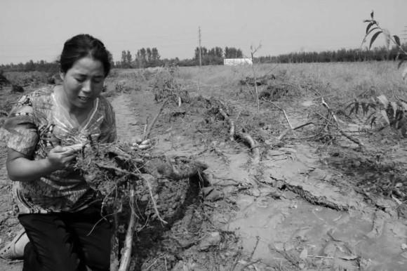 谭贵告诉记者,她家果园的果树最早的是2002年栽种的,当时购买树苗的时候,树苗的价格在10.5元到25元不等,现在按照市场价卖出去,一棵至少得40元。8月中旬,村委突然贴出征地通知,说果树按照一棵3到5元的价格补偿,让尽快腾出果园。“这样的价格太低了,我们没有同意,要求再商量商量”,令谭贵一家没有想到的是,村里居然半夜动用铲车将果树连根铲绝。