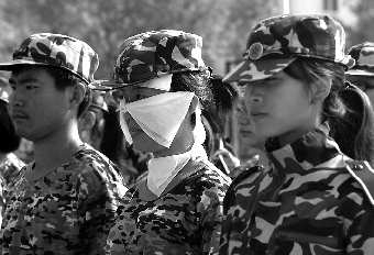 9月15日下午,在青岛大学军训场地上,一名参加军训的大一新生为了避免与毒辣辣的太阳“短兵相接”,竟用多条消毒湿巾制作了一套“防晒套装”。只是军训本是对学生们意志的锻炼,如此防晒是否违背了军训的初衷?据气象部门消息,未来两天市区温度在21。C—27。C,18日将有一场小雨降临。 本报记者张晓鹏摄影报道
