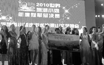 9月14日晚,2010世界旅游小姐年度冠军总决赛在水浒文化发源地梁山举行。来自世界各地的50位佳丽参加了晚礼服、泳装、知识问答等环节的比拼,中国区冠军李丹(右二)凭优秀表现,被授予“爱心小姐”荣誉称号,并获得梁山县政府赠送的水泊梁山风景名胜区终身免费游览卡。图为颁奖现场。