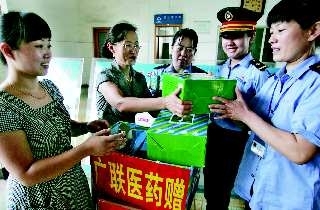 中秋佳节将至,铁路—线员工又将迎来新—轮的客流高峰,15日上午,济宁广联医药连锁有限公司的工作人员为兖州火车站的—线铁路员工赠送了润喉片、板蓝根等药品,表达自己的—份心意o 本报记者 张晓科 摄